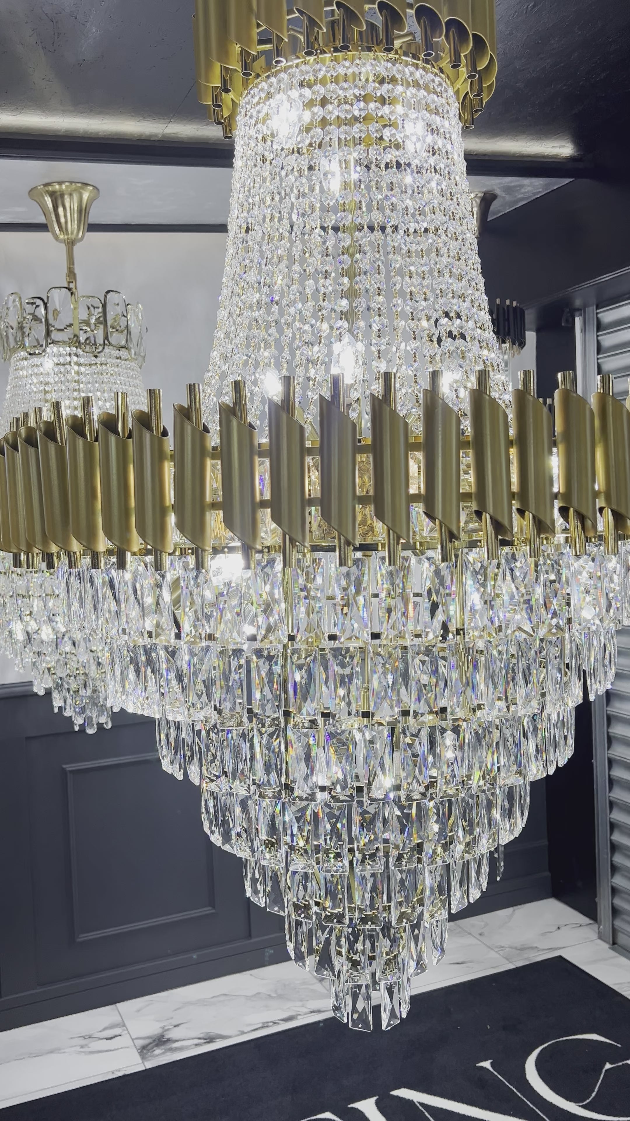 Features layered diamond cut crystal drops encased in bold black architectural fins. Designed to make a dramatic statement, it enhances double-height spaces, staircases, and entrance halls with opulence and strength.