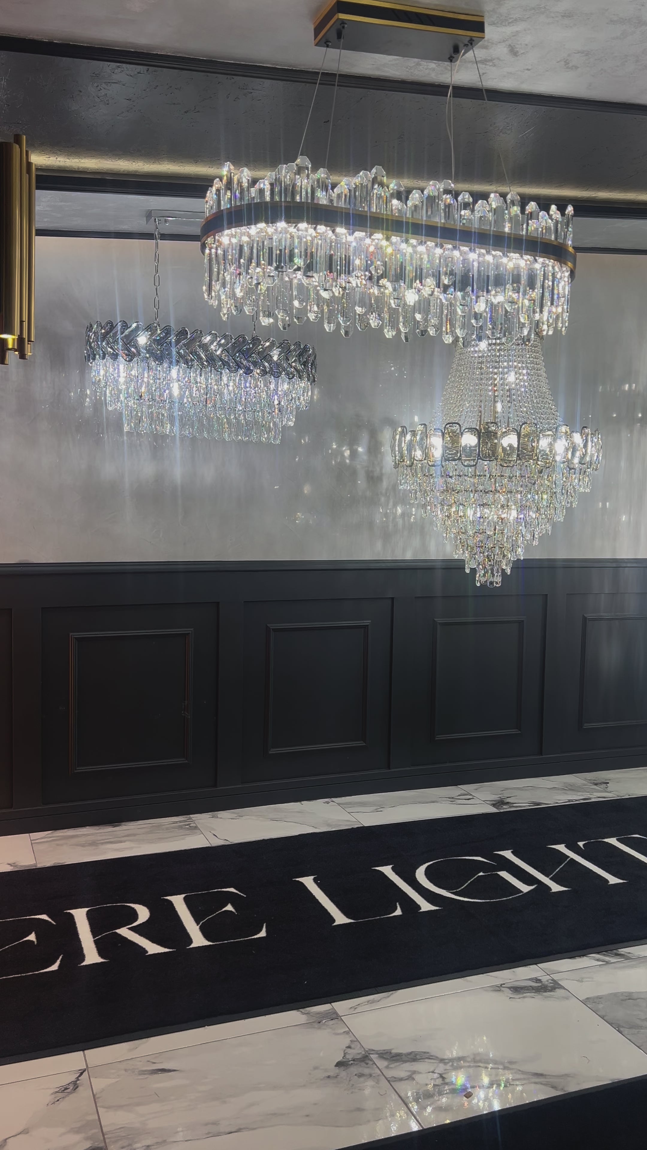 Combining diamond cut oblong crystals with a bold dual finish of #1 Matte Black and #13 Brushed Titanium Gold trim, this rectangular chandelier creates a striking visual statement. The interplay of luxurious materials and contemporary design elements elevates any upscale interior, adding a refined ambiance and a touch of sophistication.